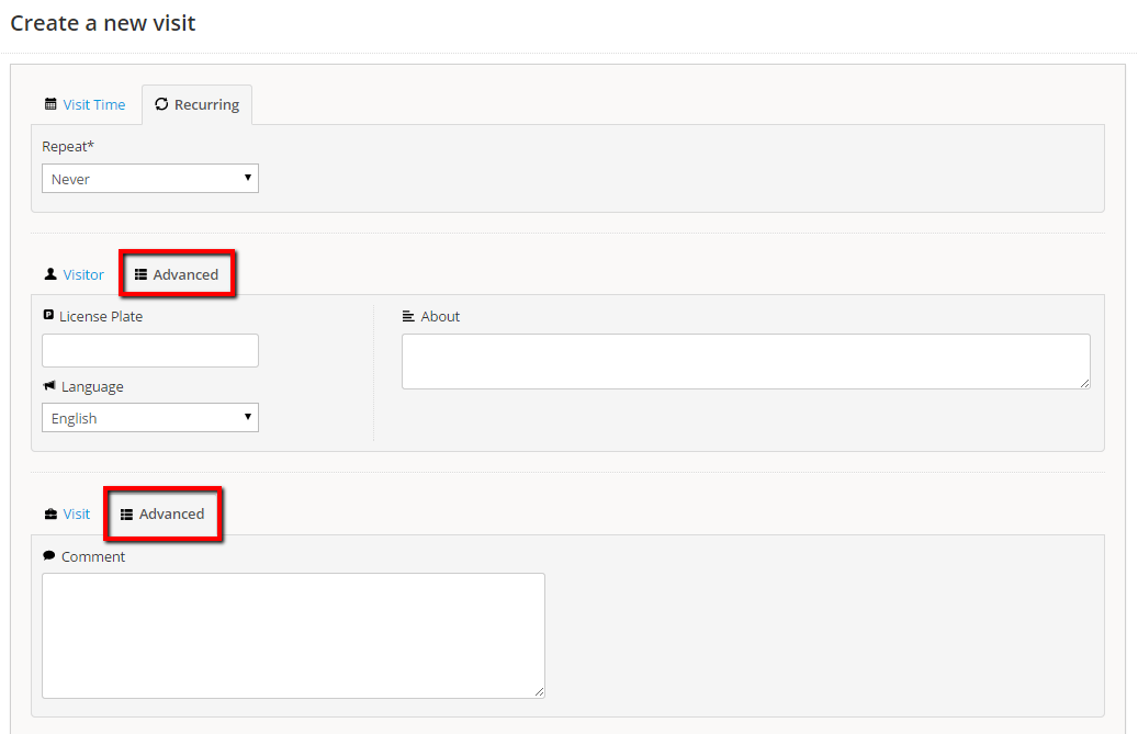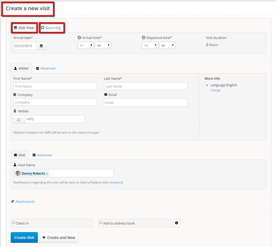 You start by inputting some information about the visitor’s details, such as: the name of the visitor, the date/time of the appointment, language, contact information, and more. You can then either make the visit a one-time thing, or click the “Recurring” tab to make it a “Repeat” visit.