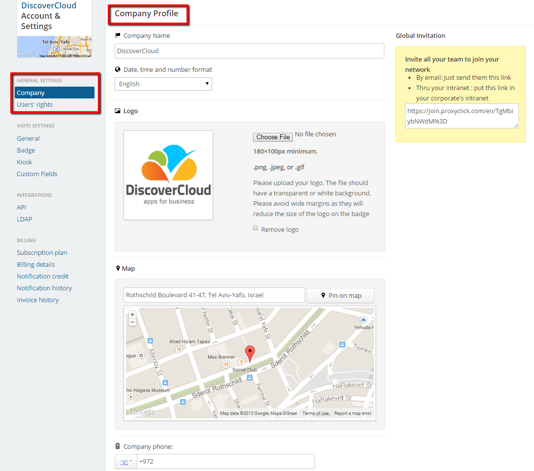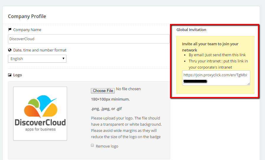 If you prefer your colleagues to join Proxyclick on their own (the advantage here being that they can pre-register their own visitors), you can send the link to your colleagues, a feature that can be found in in the yellow box on the right-hand side of your Account & Settings dashboard: