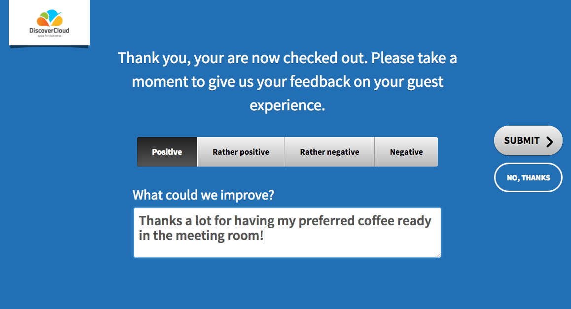 Proxyclick is dedicated to transforming the check-in/checkout process into an experience, and the Kiosk app is a perfect example of this – mostly notably in the way that it allows visitors to easily give feedback on their visit. Here’s that experience at a glance: