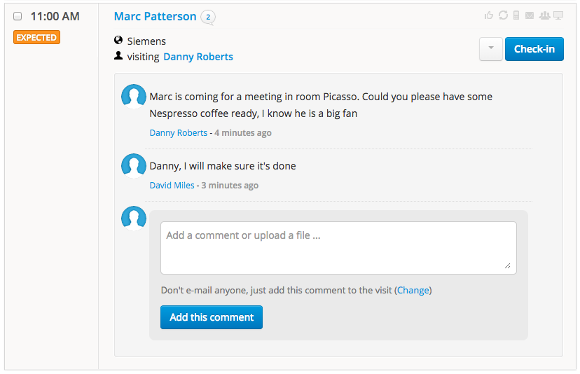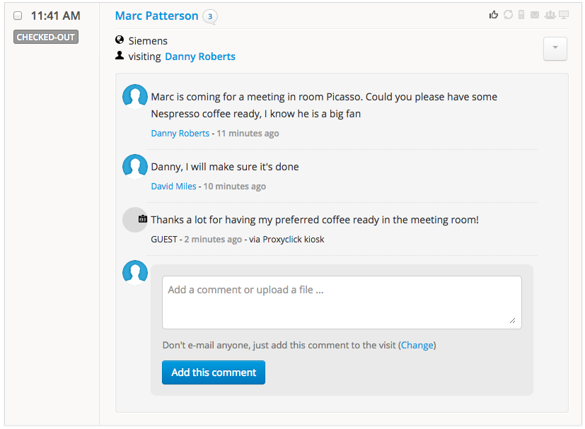 Let’s say Harry, the most important client of the day, is expected to arrive on time. Within the logbook, colleagues can discuss whatever is needed to be prepared for the meeting. Take a look at the example below: