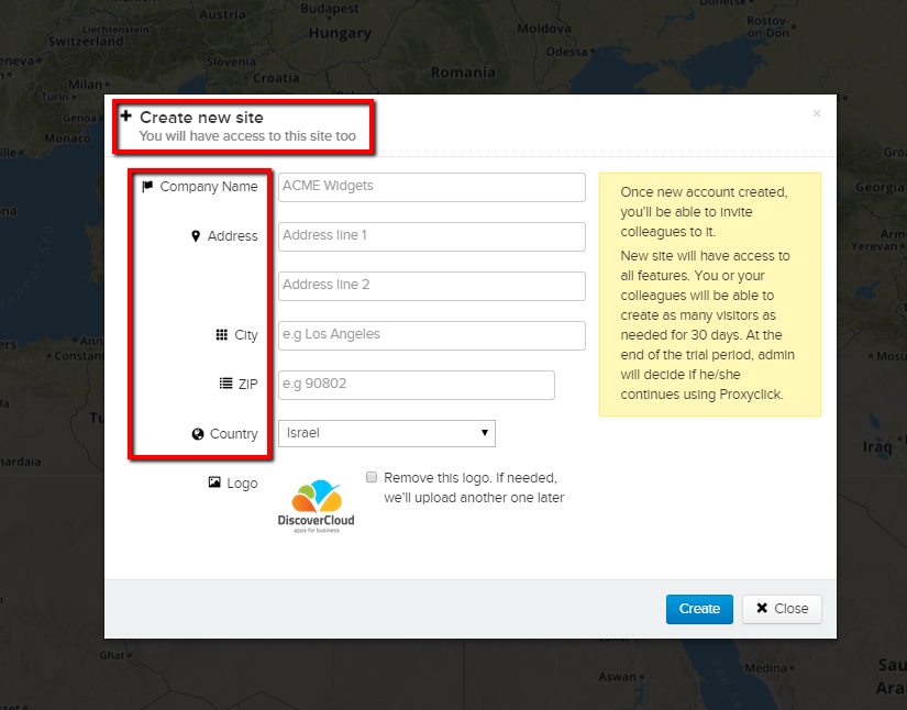 For corporations that have (or are in the process of establishing) multiple locations throughout the globe, Proxyclick allows you to easily “Create a New Site” by simply adding an address for wherever your new office is opening.