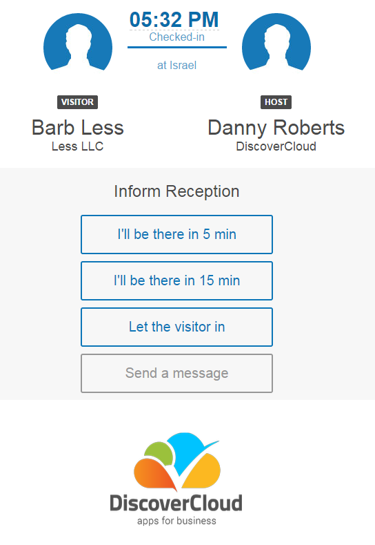Aside from this email, you can also get an SMS of arrivals sent to your mobile phone if you so choose (a customizable option in the system for each visitor/colleague).
