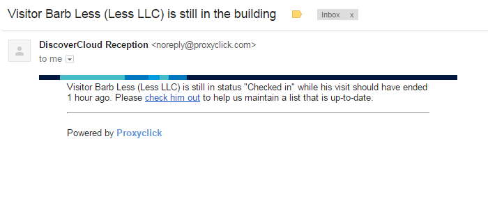 Plus, you (the host), will keep receiving email alerts indicating that your visitor is still in the system and has not yet checked out. Emails will be sent over the next 24 or 48 hours, after which point your visitor will be automatically checked out. These alerts look something like this: