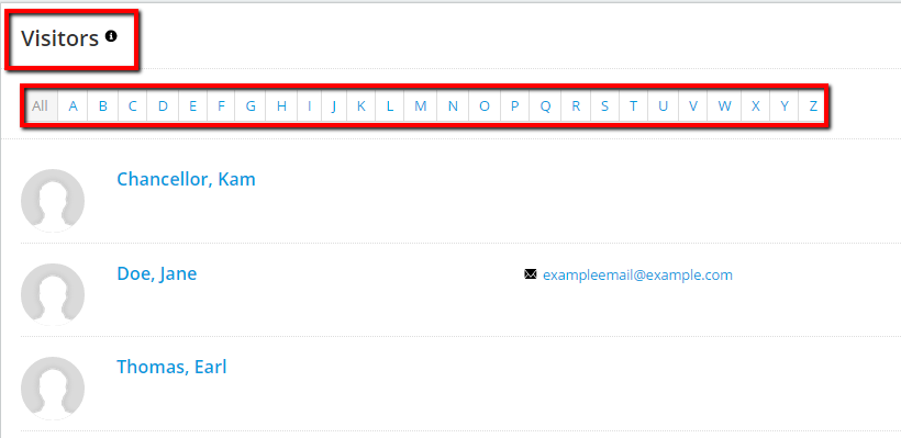 The visitors tab is essentially an address book of all visitors that you’ve ever recorded in the system. They’re sorted alphabetically, and visitors can also be searched for by last name. Take a look: