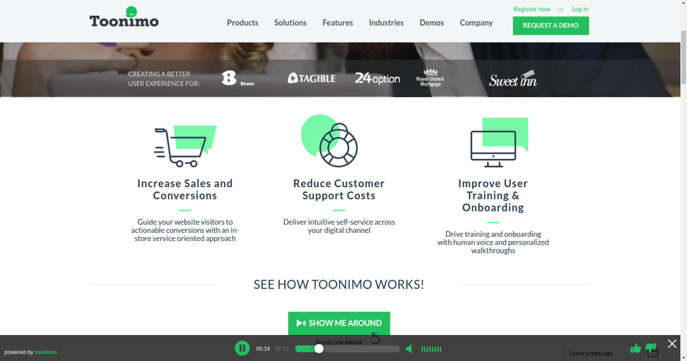 Toonimo humanizes the web user experience with engaging digital walkthroughs. The SaaS platform enables organizations to add an overlay of human voice and customized graphical annotations that engages visitors, showcases key offers and guides users through website funnels. Toonimo offers a comprehensive analytics dashboard in order to track user engagement and conversions. Driven by an intelligent decision engine, Toonimo personalizes the web user experience, encourages self-service, increases c
