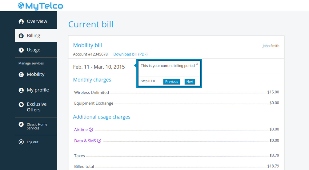 We've all experienced walkthroughs that consist of a video of someone completing a process. They may be enhanced with voice-overs, highlighting, added notes and so on. But they lack interactivity. Toonimo can give you the same kinds of special effects on your website, but in an interactive format. Toonimo can read and respond to the information that appears on the screen ("Joe, your balance due is $123.54.") as well as respond to user input ("You have just upgraded to the MegaData plan, Mrs. Smith"). Capabilities like these humanize and personalize each user's interactions with your website.